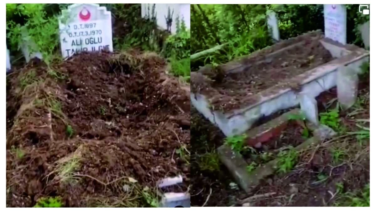 Ordu’nun Perşembe İlçesinde aç kalan domuzlar, 5 mezarı kazarak talan etti. Mezar sahipleri ise gördükleri karşısında şaşkınlık yaşayarak o anları cep telefonuyla kayda aldı.