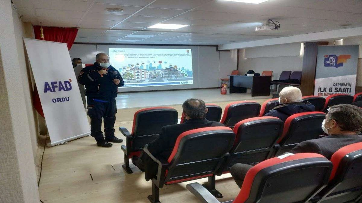 Ordu İl Afet ve Acil Durum Müdürlüğü tarafından 8 Şubat 2021 tarihinde, Altınordu ilçemizin Köprübaşı Ceren Özdemir Meydanı’nda Vali Tuncay Sonel’in de katıldığı etkinlikle startı verilen eğitim faaliyetleri, ilçelerde devam ediyor. Bu kapsamda, Altınordu, Fatsa, Ünye, Çaybaşı, İkizce, Akkuş, Aybastı ve Kabataş İlçelerinde görev yapan mahalle muhtarlarına ve azalarına afet bilinci eğitimi verildi. Yapılan eğitim faaliyetlerinin başlangıcında, “Depremin İlk 6 Saati Bir Hayat Meselesi” adlı video, eğitime katılan mahalle muhtarlarına ve azalarına izletildi. Video gösteriminin ardından, İçişleri Bakanlığınca 2021 yılının ‘Türkiye Afet Eğitim Yılı’ ilan edildiği, İlimizde en çok meydana gelen afetlerin başında sel ve heyelanın olduğunu, bu nedenle muhtarlarımızın mahallelerinde meydana gelen afet ve acil durumlarla ilgili gerekli hassasiyeti göstermeleri, afet sonrası vatandaşlarımızı izlemesi gereken yollar konusunda bilgilendirmeleri ve İl Afet ve Acil Durum Müdürlüğü ile sürekli iletişim halinde olmaları gerektiği belirtildi. İl Afet ve Acil Durum Müdürlüğünce verilen eğitimlerle, ilimizdeki tüm vatandaşlarımıza başta deprem olmak üzere ülkemizde sıkça görülen afetlere yönelik olarak, afetlerin öncesi, sırası ve sonrasında yapılacak doğru davranışları kazandırmak amaçlanıyor. Afet bilinci eğitimleri, 2021 yılı içerisinde diğer ilçelerimizin muhtar ve azaları, sivil toplum kuruluşları, kamu kurum ve kuruluşları, öğrencilere ve vatandaşlarımıza verilmeye devam edilecek.