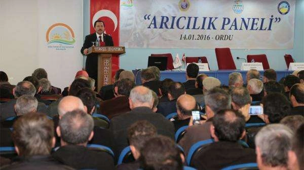 Ordu Gıda, Tarım ve Hayvancılık Müdürlüğü, Doğu Karadeniz Kalkınma İdaresi Başkanlığı(DOKAP) ve Ordu İli Arı Yetiştiricileri Birliği tarafından organize edilen ‘Arıcılık Paneli’, Ordu’da yapıldı. Grand TESK Hotel’de gerçekleştirilen panele Ordu Valisi İrfan Balkanlıoğlu, Altınordu Belediye Başkanı Engin Tekintaş, İl Gıda, Tarım ve Hayvancılık Müdürü Kemal Yılmaz, Doğu Karadeniz Kalkınma İdaresi Başkanlığı(DOKAP) Ekrem Yüce, Türkiye Arı Yetiştiricileri Merkez Birliği Başkanı Bahri Yılmaz, Ordu İli Arı Yetiştiricileri Birliği Başkanı Necati Aydın, Altınordu Ziraat Odası Başkanı Uğur Cörüt, bazı daire müdürleri ile çok sayıda bölge arıcısı katıldı. HEDEF DÜNYA BİRİNCİLİĞİ Türkiye Arı Yetiştiricileri Merkez Birliği Başkanı Bahri Yılmaz burada yaptığı konuşmada, Türkiye’nin dünya bal üretiminde Çin’den sonra 2. sırada yer aldığını, hedeflerinin önümüzdeki yıllarda dünya birincisi olmak olduğunu belirtti. 80 ilde örgütlendiklerini, 58 bin üyeye sahip olduklarını belirten Yılmaz, “6.8 milyon arı kovanı ve yıllık ortalama 103 bin ton bal üretimi ile dünyanın 2. sırada yer alan ülkesiyiz. Türkiye arıcıları olarak ileriye yönelik hedefimiz, bu sektörde dünyada bir numara olmak. Biz üreticiler olarak 2009 yılında Gıda, Tarım ve Hayvancılık Bakanlığımız ile ortak bir karara vardık ve dedik ki biz dünya arıcılık kongresini ülkemize getirip burada yapacağız. 2017 yılın da İstanbul’da yapılacak olan kongreye 150 ülkeden gelen arıcı ve bilim adamlarına, Türkiye arıcıları olarak bu işi nasıl yaptığımızı tanıtacağız” dedi. “SAHTE BALA KARŞI SIKI ÖNLEM ALIYORUZ” Bal sektöründe en büyük baş ağrısının ‘sahtecilik’ olduğuna dikkat çeken Yılmaz, “Kuruluş olarak bizler, sektörde yaşanan sahtecilikleri de ayrıca tespit edip ilgili mercilere bildiriyoruz. Arı sütü üretimi konusunda yaşanan sahtecilik olaylarının bir daha tekrarlanmaması için Gıda, Tarım ve Hayvancılık Bakanlığımız başvuruda bulunduk ve kendileri de bizlere, üniversitelerin bu alanda çalışma yürüten bölüm laboratuvarlarında incelenmesi önerisinde bulundular” diye konuştu. Panelde konuşan Ordu Valisi İrfan Balkanlıoğlu, böyle bir toplantının Ordu’da yapılmasından dolayı mutlu olduğunu belirterek, balda sahteciliğe dikkat çekti. Vali Balkanlıoğlu, “Kaliteli ürün üretenlerin dışında bir defa bunların sahtekarlarıyla uğraşmak durumundasınız. Kaliteli bal üreten insanlar emeğini alamıyor. Bu konuda da çalışmalar yapılması lazım” şeklinde konuştu. Altınordu Belediye Başkanı Engin Tekintaş da 1985 yılında arıcılık yaptığını ve bu sektörü yakından bildiğini dile getirdi. Tekintaş, Ordu Arıcılık Araştırma Enstitüsü alanında inşa edilen bal ve paketleme tesis ve araştırma laboratuvarına dikkat çekerek, “Yaklaşık 30 milyonu aşan bir yatırımla bu iş gerçekleşmiş oldu. Laboratuvarı ve teknik donanımları kısacası her şeyi ile marka ürünlerin buradan çıkabileceği, sahteciliğin önüne geçileceği bir yapı olmuş” ifadelerini kullandı. “ORDU BALI DENDİĞİNDE KALİTELİ BAL DENİLMELİDİR” İl Gıda Tarım ve Hayvancılık Müdürü Kemal Yılmaz, Ordu’nun fındıktan sonra bal üretiminde de lider il konumunda olduğunu belirtti. Ordu’da halen 3 bin aktif arıcının bulunduğunu belirten Yılmaz şöyle konuştu: “2015 yılında 16 bin 600 ton bal üretimimiz vardır. 91 ton da bal mumu üretimimiz bulunmaktadır. Arıcılarımıza çok ciddi destekler sunuyoruz. Arıcılarımıza son 2 yılda 11 milyon TL bakanlığımızın aktif koloni desteği verildi. Şu anda da ödemeleri devam ediyor. Kırsal kalkınma yatırımlarından çok ciddi kaynaklar aktarıldı 500 bin TL hibe desteği arıcılarımıza. TKDK’dan, DOKAP’tan çok ciddi kaynaklar sağlandı. Burada tüm kurumlar çok ciddi eğitimlerle arıcılarımız desteklendi. Bugün bal üretimi dendiğinde, bal dendiğinde Ordu akla geliyorsa, bundan sonra kaliteli bal dendiğinde, polen, propolis dendiğinde, arı sütü dendiğinde, Ordu’nun akla gelmesini temin etmek durumundayız. Bu konuda arıcılarımıza çok ciddi sorumluluklar düşüyor.” Yapılan protokol konuşmalarının ardından panele geçildi. Panelde, Prof. Dr. Sevgi Kolaylı tarafından ‘Arı Ürünleri ve Apiterapi’, Şaban Akpınar tarafından ‘Balda Kalıntı’, Ali Korkmaz tarafından da ‘Arı ve Ana Arı Yetiştiriciliği’ konularında sunumlarda bulunuldu.