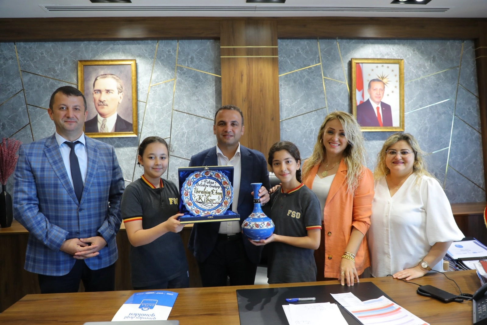 Sakarya Ortaokulu Müdürü Nazım Aslaner, Okul Aile Birliği Başkanı Tülay Demirbaş, Yönetim Kurulu Üyesi Gülhan Bağana ve okul öğrenciler Buğlem Bellice ve Miray Sözeri Başkan Kibar’ı ziyaret ettiler. Ziyaretlerinde ilçemizde eğitim ve öğretim konuları konuşuldu. Okul öğrencileri Buğlem Bellice ve Miray Sözeri Belediye Başkanı İbrahim Etem Kibar’a hediye takdiminde bulundular. Fatsa Belediye Başkanı İbrahim Etem Kibar ise gelecek hafta Sakarya Ortaokulunda söyleşi sözü verdi. Başkan Kibar ziyaret sonrasında, “Nazik ziyaretleri ve kıymetli hediyeleri için kendilerine teşekkür ederim.” dedi.