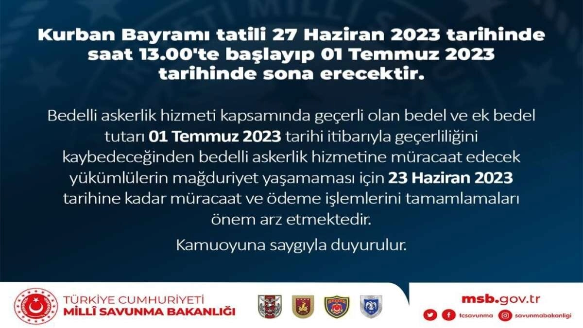 Milli Savunma Bakanlığı'ndan (MSB) bedelli askerlik ile ilgili bir son dakika açıklaması geldi. MSB'nin sosyal medya hesabından duyurulan açıklamada, bedelli askerlik hizmetine müracaat edecek yükümlülere yönelik önemli ödeme uyarısı yapıldı. SON GÜN 23 HAZİRAN MSB'den yapılan açıklamada "Kurban Bayramı tatili 27 Haziran 2023 tarihinde saat 13:00'te başlayıp 1 Temmuz 2023 tarihinde sona erecektir. Bedelli askerlik hizmeti kapsamında geçerli olan Bedel ve ek bedel tutarı 1 Temmuz 2023 tarihi itibarıyla geçerliliğini kaybedeceğinden bedelli askerlik hizmetine müracaat edecek yükümlülerin mağduriyet yaşamaması için 23 Haziran 2023 tarihine kadar müracaat ve ödeme işlemlerini tamamlamaları önem arz etmektedir. Kamuoyuna saygıyla duyurulur" denildi.