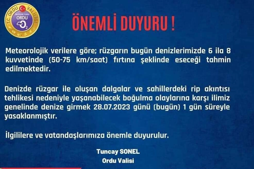 "Bugün, denizlerimizde rüzgar fırtına şeklinde eseceğinden, oluşacak dalgalar ve rip akıntısı nedeniyle yaşanabilecek boğulma olaylarına karşı ilimiz genelinde bugün için denize girmek yasaklanmıştır. Can güvenliğimiz için lütfen bugün denize girmeyelim."