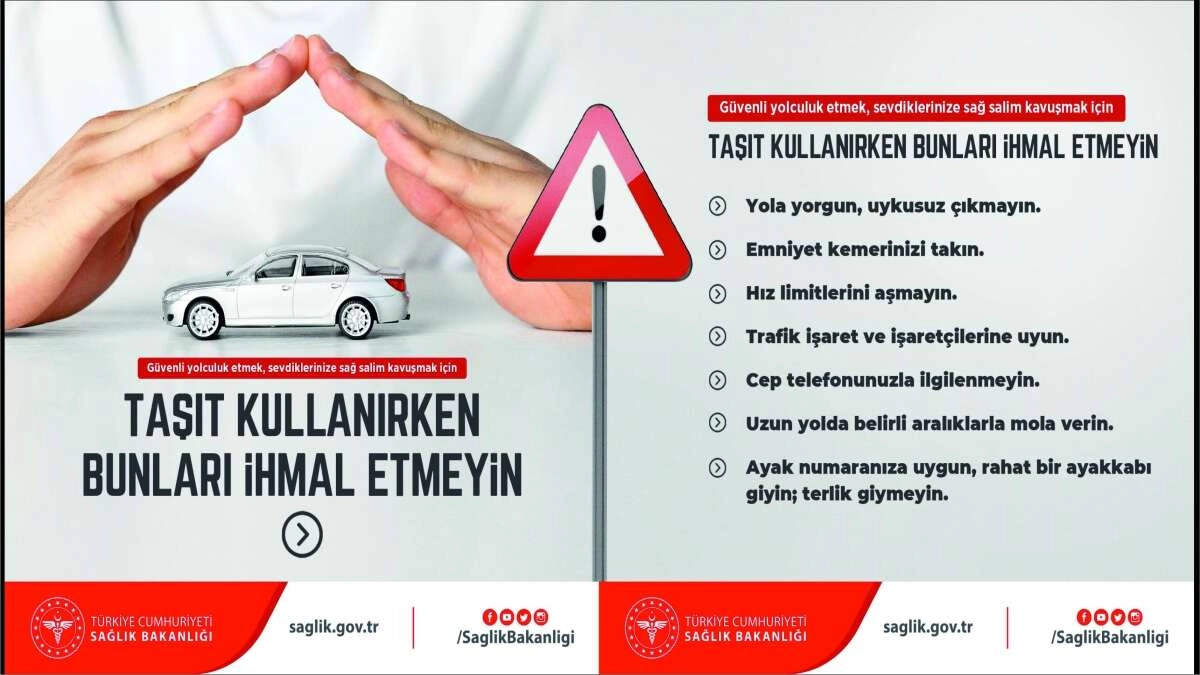 "Güvenli yolculuk etmek, sevdiklerinize sağ salim kavuşmak için taşıt kullanırken bunları ihmal etmeyin: - Yola yorgun, uykusuz çıkmayın. - Emniyet kemerinizi takın. - Hız limitlerini aşmayın. - Trafik işaret ve işaretçilerine uyun. - Cep telefonunuzla ilgilenmeyin. - Uzun yolda belirli aralıklarla mola verin. - Ayak numaranıza uygun, rahat bir ayakkabı giyin; terlik giymeyin." Haber Merkezi