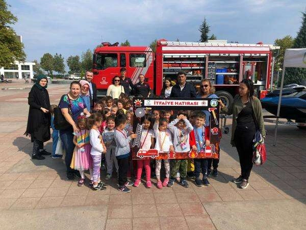 Ana sınıfı öğrencileri itfaiye araçları ile bol bol fotoğraf çektirirken okul öğretmenleri de uygulamalı olarak öğrencilere bilgi verdi.
