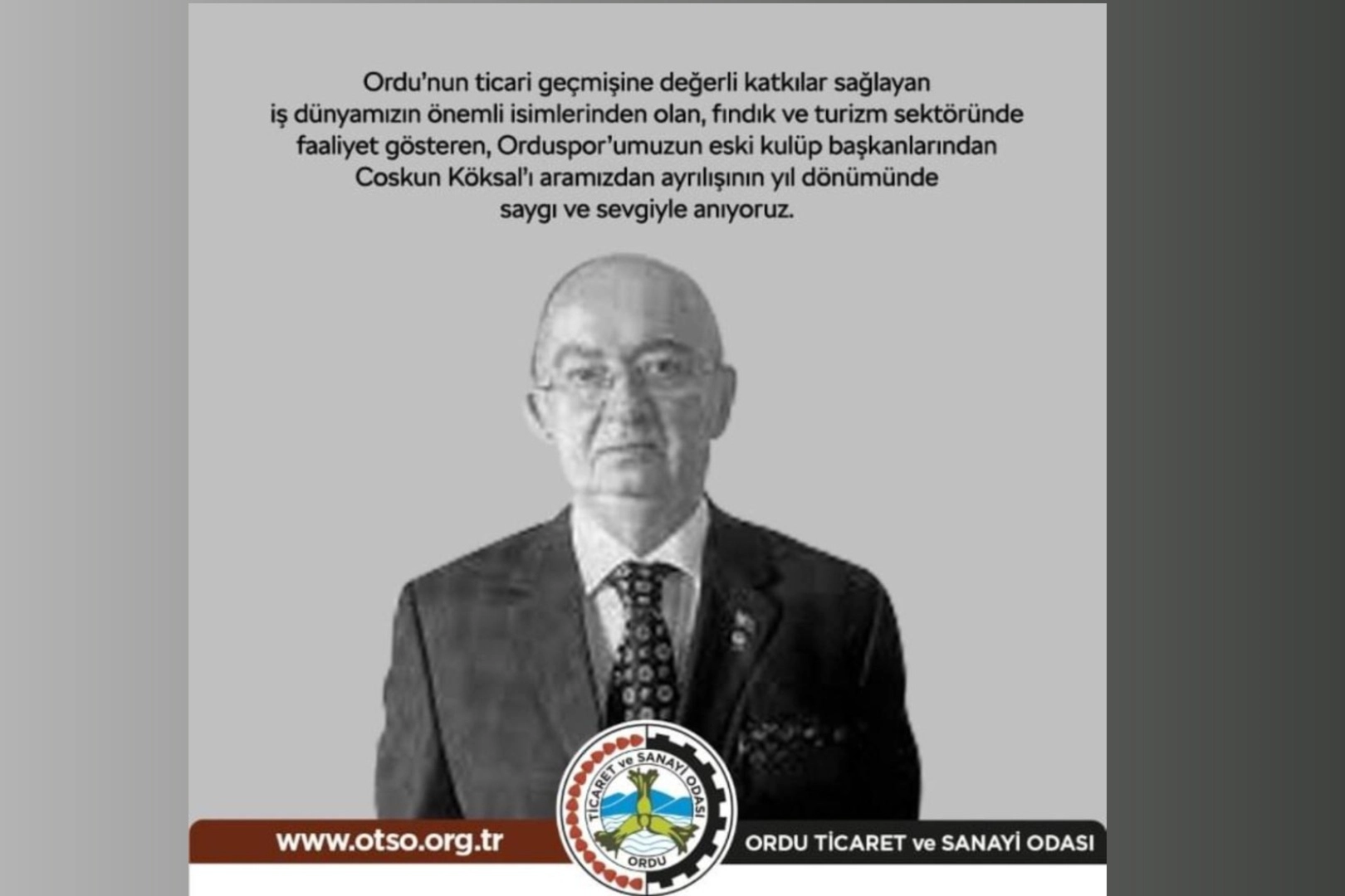Oda tarafından Köksal için anma mesajı yayımlandı. Yayımlanan mesajda şu ifadelere yer verildi: “Ordu'nun ticari geçmişine değerli katkılar sağlayan iş dünyamızın önemli isimlerinden olan, fındık ve turizm sektöründe faaliyet gösteren, Orduspor'umuzun eski kulüp başkanlarından Coşkun Köksal'ı aramızdan ayrılışının yıl dönümünde saygı ve sevgiyle anıyoruz.” denildi. Haber: Müjdat Hülür
