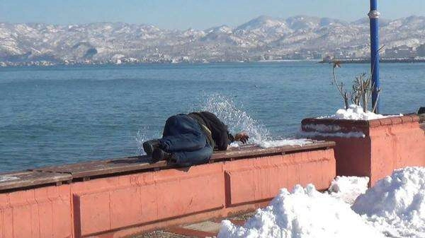 Fatsa’da bir vatandaş güneşli ve çok soğuk havada sahilde uyurken objektiflere yakalandı.