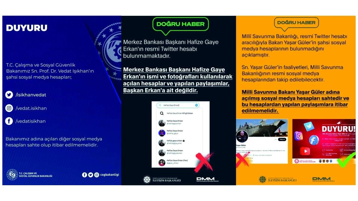 Kamuoyunda merakla beklenen Kabine Üyelerinin açıklanmasının ardından bazı sosyal medya kullanıcıları Bakanlar adına sahte hesaplar açarak doğruluk payı olmayan paylaşımlar yapmaya başladı. Sadece Kabine üyelerinin değil hemen hemen kamuoyunda tanınan çoğu isim için açılan sahte hesaplar çok ses getirmeden kapatılsa da Bakan sıfatında olan şahıslar adına açılan hesaplar vatandaşın yanlış algıya düşmesine neden oluyor. Sosyal medyanın kullanımının artması ile doğru bilgi ve yanlış bilgi ayrımı için İletişim Başkanlığı tarafından Dezenformasyonla Mücadele Merkezi kurulmuş ve vatandaşların doğru bilgi alması konusunda çalışmalar yapılmaya devam ediyor. Vatandaşların ise sahte hesaplara inanmaları için Bakanlıkların sosyal medya hesaplarında ‘’Bakanlarımızın Doğru Sosyal Medya Hesabı’’ budur ya da ‘’Bakanımızın Sosyal Medya Hesabı bulunmamaktadır’’ gibi paylaşımlar yapılmaya başlandı. Haber; Nusret YEŞİLLER