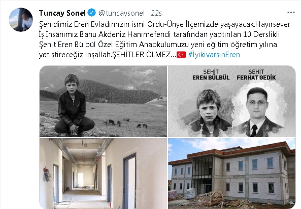 Trabzon'un Maçka ilçesi kırsalında, 11 Ağustos 2017'de PKK'lı teröristlerle sıcak temas sırasında şehit olan Eren Bülbül'ün isminin verileceği anaokulu inşattı bütün hızıyla devam ediyor. Ordu Valisi Tuncay Sonel, sosyal medya hesabından yaptığı paylaşımda, Eren Bülbül'ün isminin Ünye ilçesinde yaşatılacağını belirtti. Sonel, hayırsever iş insanı Banu Akdeniz tarafından yaptırılan 10 derslikli Şehit Eren Bülbül Özel Eğitim Anaokulunu yeni eğitim öğretim yılına yetiştireceklerini vurgulayarak, "Şehitler ölmez. İyi ki varsın Eren." ifadelerini kullandı.