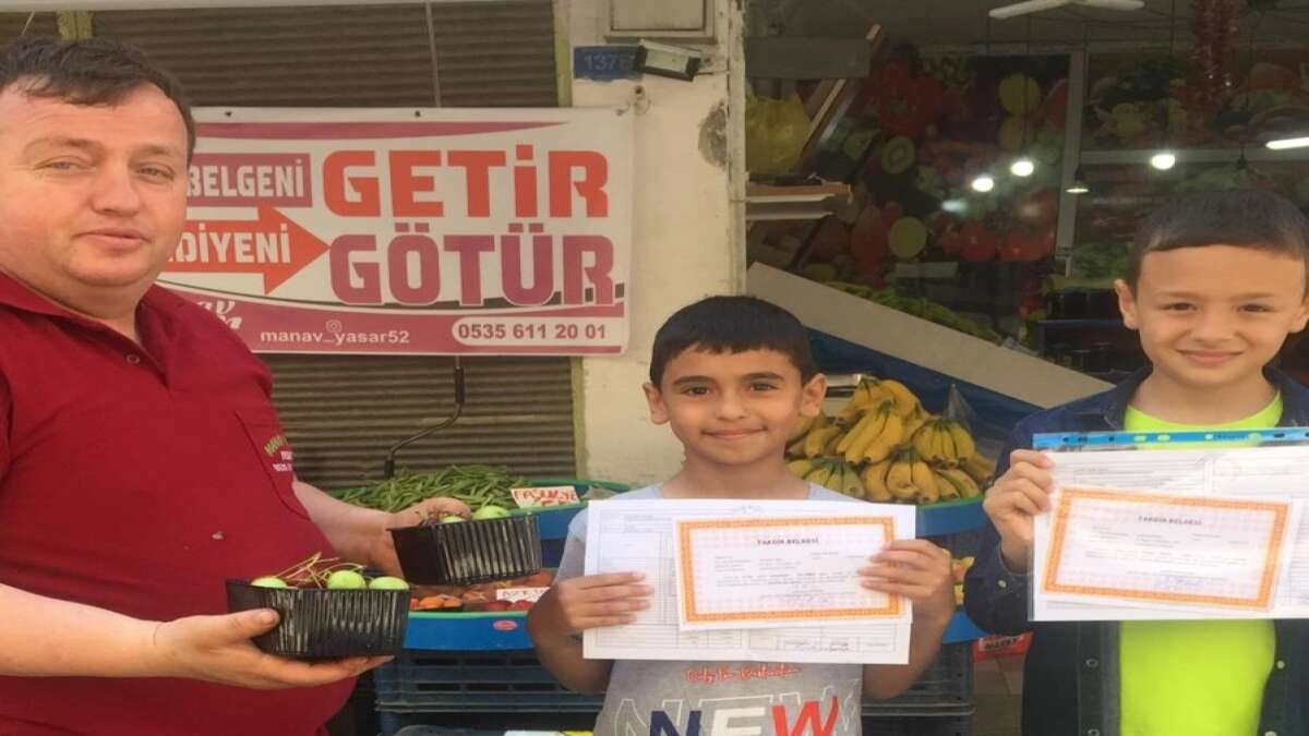 Fatsa Mağazalarbaşı esnaflarından Manav Yaşar, başarılı öğrencileri meyve ile ödüllendiriyor.