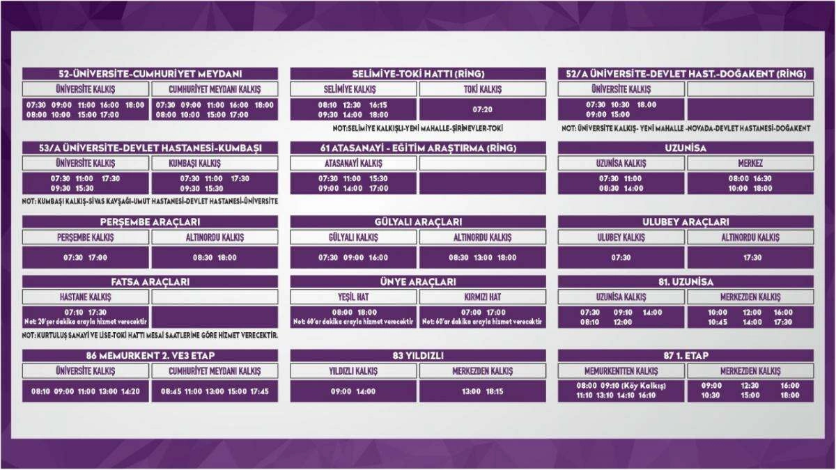 Kısıtlama süresince sağlık çalışanları ve zorunlu görevleri nedeniyle çalışmak zorundaki vatandaşların mağdur olmaması için çalışma yapan Ordu Büyükşehir Belediyesi Ulaşım Daire Başkanlığı bu kapsamda 29 Nisan 2021 itibari uygulanmaya başlayacak olan yeni düzenlemeleri hayata geçirdi. Uygulanacak olan yeni düzenleme şu şeklide olacak. *52-Üniversite-Cumhuriyet Meydanı seferleri, sabah 07:30 ile akşam 18,00 arasında karşılıklı olarak 1 saat arayla yapılacak. * Selimiye TOKİ hattı (RİNG) Selimiye kalkış saatleri; 08:10- 09:30- 12:30-14:00-16:15-18:00, TOKİ kalkış: 07:20 arasında sefer düzenlemesi yapılacak. *52/A üniversite-Devlet Hastahane.-Doğakent (Ring) Üniversite Kalkış saatleri; 07:30- 09:00 -10:30-15:00 ve 18:00 olacak. *53/A Üniversite-Devlet Hastanesi-Kumbaşı arasında dolmuşlar ise karşılıklı olarak; 07:30-9:30-11:00-15:30 ve 17:30 olarak gerçekleşecek. *61 Atasanayi - Eğitim Araştırma (Ring) Ata Sanayi Kalkış saatleri; 7:30-9:00-11:00-14:00-15:30 ve 17:00 olarak gerçekleşecek. *Uzunisa araçlarının kalkış saatleri şu şekilde; Uzunisa Kalkış, 7:30-9:30-11:00 ve 14:00 Merkez’den kalkış saatleri ise; 8:00-10:00-16:30 ve 18:00 olarak gerçekleşecek. * Perşembe Araçları Kalkış: 07:30 ile 17:00 arasında Perşembe’den kalkarken, Altınordu’dan Perşembe’ye ise; 08:30 ile 18:00 arasında gerçekleşecek. *Gülyalı Araçları merkezden 07:30-9:00 ile 16:00 arasında hareket ederken Altınordu merkezden Gülyalı’ya ise; 08:30-13:00 ve 18:00 saatleri arasında sefer düzenlenecek. *Ulubey araçları ise sabah 07:30’dan Ulubey’den hareket ederken Altınordu’dan akşam 18:00’da Ulubey’e sefer düzenleyecek. * 81 Uzunisa Araçları karşılıklı seferleri: Merkezden sabah saat: 07:30-08:10-9:10-12:00 ve 14:00 saatleri arasında yaparken, merkezden ise kalkış saatleri; 10:00-10:45-12:00-14:00-16:00 ve 17:30 saatleri arasında yapacak. *86 Memurkent 2. Ve 3. Etap araç kalkış saatleri; Eskipazar’dan kalkış, 08:10- 09:00-11:00-13:00 ve 14:20 olacak. Merkezden kalkış saatleri ise; 08:45-11:00-13:00-15:00 ve 17:45 olarak sefer düzenleyecek. *83 Yıldızlı araçları kalkış saatleri; 09:00 ile 14:00 arasında olurken, merkezden kalkışlar ise, 13:00 ile 18:15 arasında olacak. *87 1. Etap araçları kalkış saatleri; Memurkentten kalkış, 08:00 -( Köy Kalkış) 09:10- 11:10-13:10-14:10 ve 16:10 olacak. Merkezden kalkış ise; 09:00-10:30-12:30-15:00-16:00 ve 18:00 olarak gerçekleştirilecek. *Fatsa Araçları Hastahane Kalkış: 07:10 ile 17:30 arasında ( 20’şer dakika arayla karşılıklı hizmet verecek) Ayrıca, Kurtuluş Sanayi ve Lise-Toki Hattı mesai saatlerine göre hizmet verecektir. *Ünye Araçları: ( Yeşil Hat) 08:00 ile 18 arasında hizmet verirken, Kırmızı Hat ise; 07:00 ile 17:00 arasında ( 60 dakika arayla hizmet verecektir.)