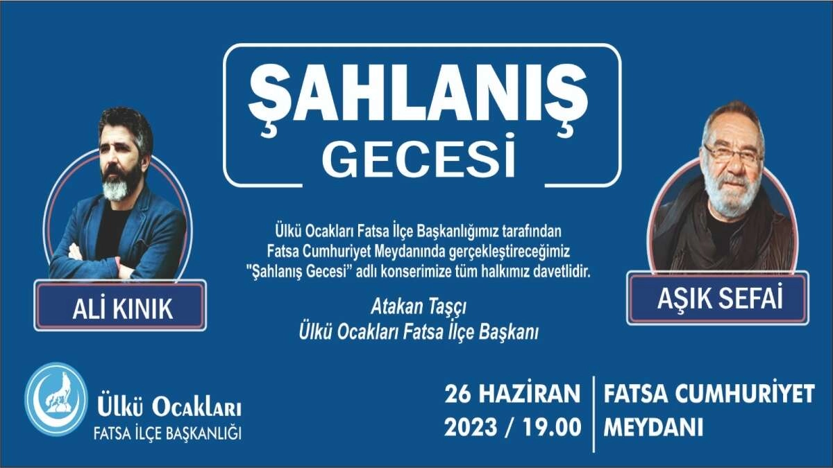 Ülkü Ocakları Fatsa İlçe Başkanlığı tarafından 26.06.2023 Pazartesi günü saat 19:00'da Fatsa Cumhuriyet Meydanı'nda "Şahlanış Gecesi” adlı konser düzenleniyor.