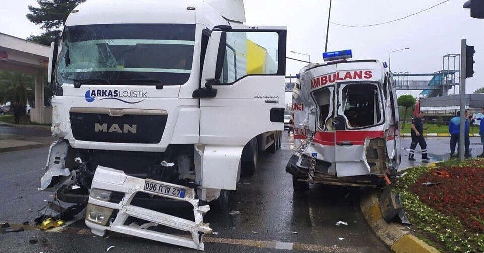 Ünye’de meydana gelen kazada, kontrolünü kaybeden tır ambulansa çarparak durabildi.