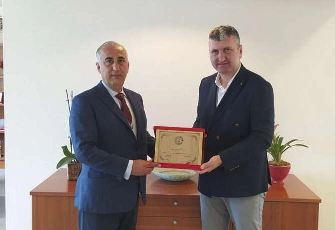 Ünye Ticaret Odası Başkanı İrfan Akar, OYAK Ünye Çimento Fabrika Müdürü İhsan Erçin’e, Ünye’nin gelişimine yaptığı katkılardan dolayı teşekkür plaketi verdi.