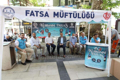 Fatsa Müftüsü Hamza Bayram “Kurbanını Paylaş, Kardeşinle Yakınlaş” şiarıyla aziz milletimizin emanetlerini büyük bir titizlikle ihtiyaç sahiplerine ulaştırmak üzere Kavlan ağacının yanında açılan standımızda siz kıymetli vatandaşlarımızı bekliyoruz." dedi