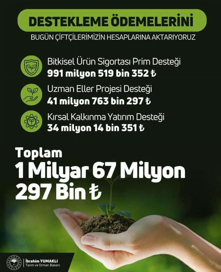 Tarım ve Orman Bakanı İbrahim Yumaklı, 1 milyar 67 milyon 297 bin liralık tarımsal destekleme ödemelerinin bugün hesaplara yatırılacağını müjdeledi.
