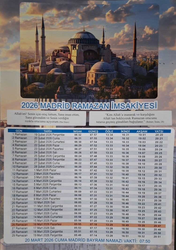 Babacığım; daha başta küçük kızımın yaptığını söyleyeyim; çok hoşuna gidecek. Sen git; bilgisayarcıda Madrit namaz vakitlerini buldurup oradan İMSÂKİYE düzenleyip bastıttır! Fesübhânallâh. Kimin aklına gelir. Sen Betül'ü zâten biliyorsun. Hep yanında yörendeydi küçüklüğünden beri. Allâh CC nazardan saklasın. Burda bizim işimize çok yaradığı kadar Sâlim'in ilettiği arkadaşları falan çok orijinâl, incelikli bulup teşekkürler etmişler. Bir de, yanımızda o imsâkiyeden başka Ramazan alâmeti bir materyâl yok. Allâh CC râzı olsun. Onu da hayırlılarla karşılaştırıp her türlü işlerini kolaylaştırsın. Âmîn... GELMEDEN ÖNCE, ZİYÂRETTEN SONRA